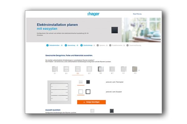 Mit dem easyplan Konfigurator haben Sie die Möglichkeit, unterschiedliche Schalterdesigns ganz nach Belieben zu konfigurieren. Einfach gewünschte Designlinie, Farbe und Materialität auswählen und den entsprechenden Räumen zuweisen. Pro Planung können Sie bis zu drei unterschiedliche Schalterdesigns konfigurieren.